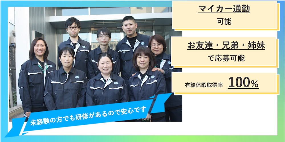 ■賞与年2回 ■昇給有 ※正社員登用制度もあります。 ■退職金制度有(勤続年数3年以上) ■交通費規定支給 ☆只今キャンペーン中(条件有り) 入社祝い金:6ヶ月勤務すると10,000円 継続祝い金:1年勤務すると10,000円 |
